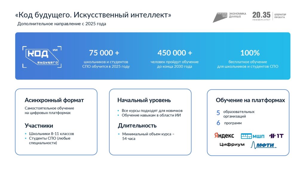 В рамках проекта «Код будущего. Искусственный интеллект» слушатели могут освоить курсы объемом 54 академических часа, самостоятельно обучаясь на цифровых образовательных платформах.