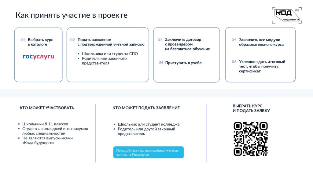 Подать заявление на участие в проекте «Код будущего. Искусственный интеллект» может как сам обучающийся, так и его родитель (законный представитель). Для этого потребуется паспорт гражданина Российской Федерации и подтвержденная учетная
