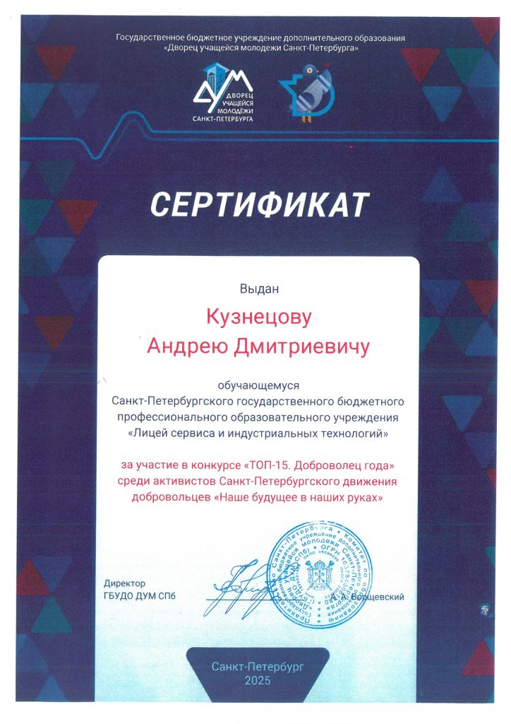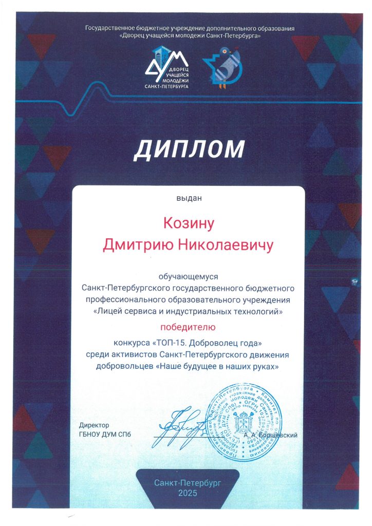 Мы поздравляем Козина Дмитрия, который вошел в число 15 лучших добровольцев СПО города!