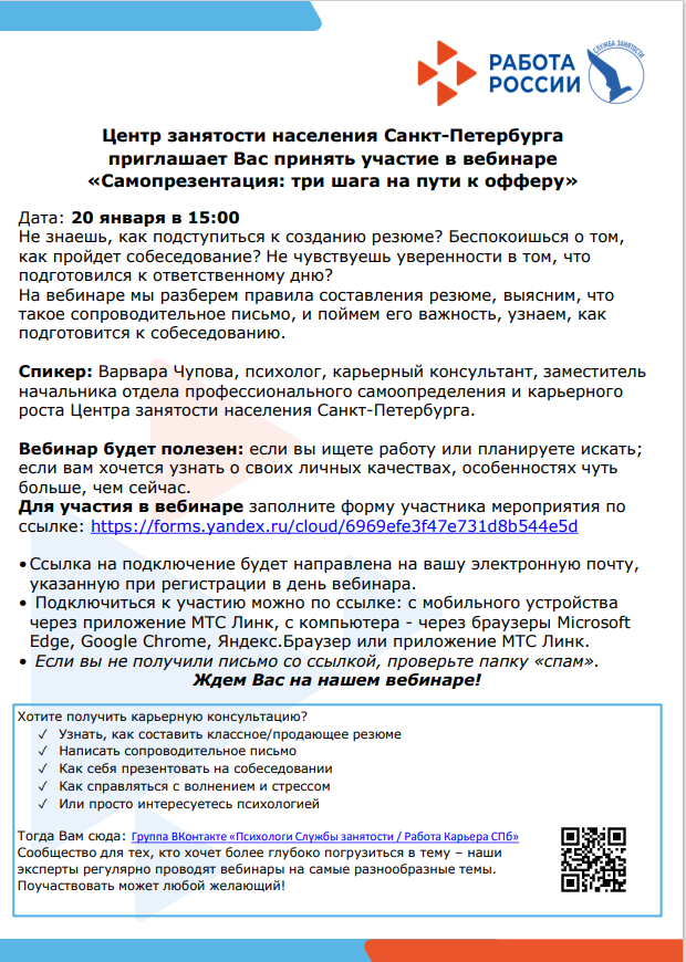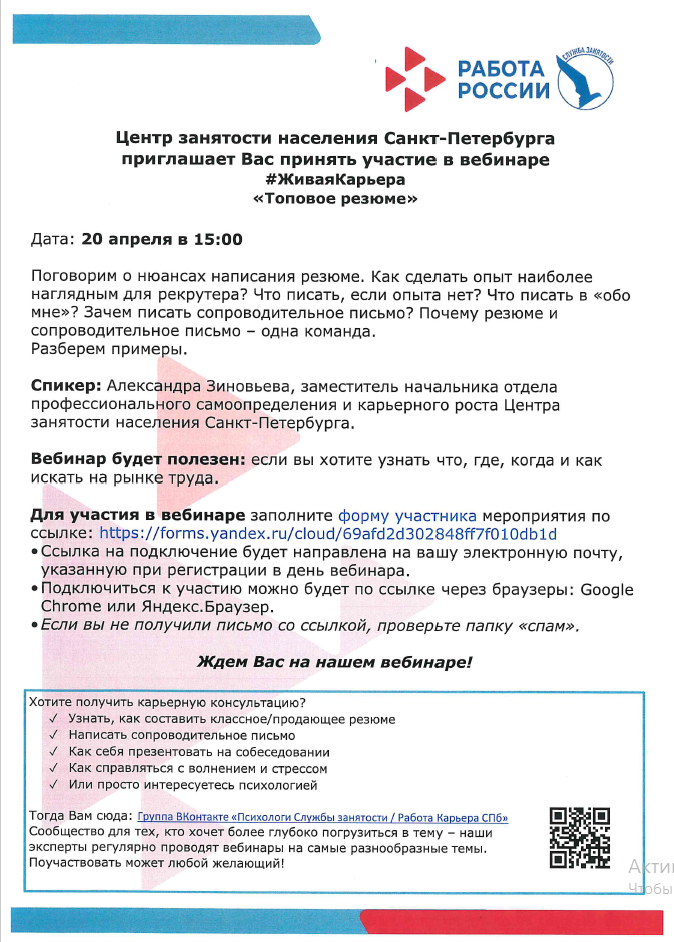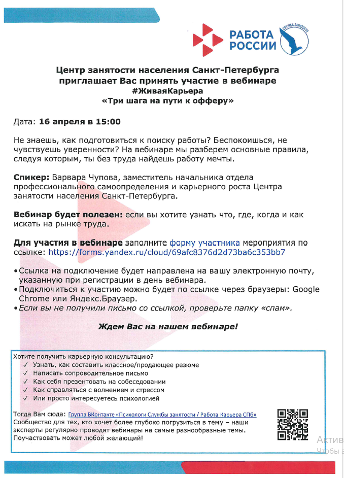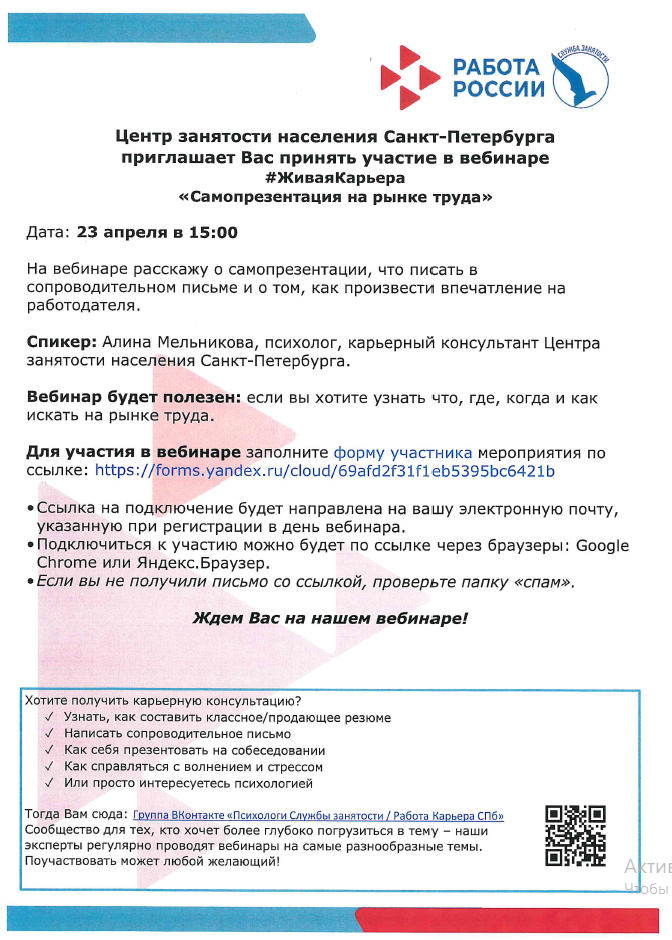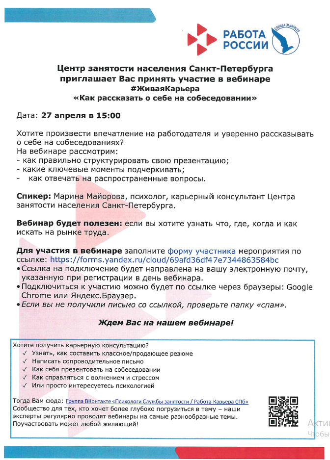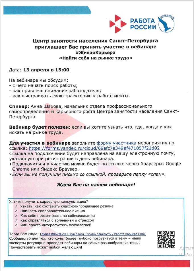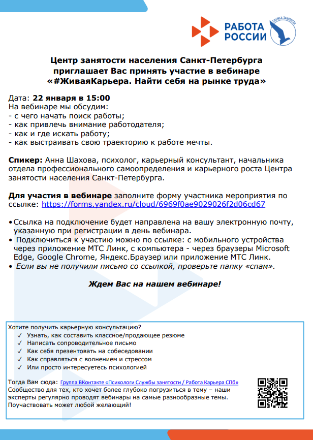 Центр занятости населения Санкт-Петербурга, проводит для выпускников онлайн мероприятие «#ЖиваяКарьера«. Для участия необходимо заполнить формы регистрации, ссылки для подключения придут на электронный адрес указанный при регистрации: